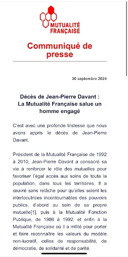 "Les Mutuelles de France saluent la mémoire de Jean-Pierre Davant, disparu récemment, président de la Mutualité Française entre 1992 et 2010, avec qui elles ont dessiné l’unification du mouvement mutualiste conclu en 2002".